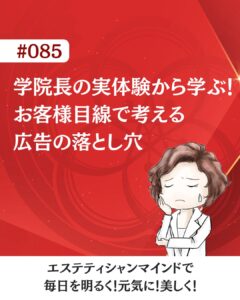 新サイズ Instagram投稿画像 (1080 x 1350px) (7) 2025年10月14日 WRITER kanri@youplando この記事を書いている人 - WRITER - kanri@youplando この記事を書いている人 - WRITER - kanri@youplando 関連記事 - Related Posts - ポッドキャスト番組 #009 エステティックサロンってどんなことをするの?~内面的なケア~ が配信されました。 ポッドキャスト番組 034.講師になるまでの過程と修業時代~オレンジの時代~Part1が配信されました。 《エステティックサロン経営に必要なこと》 独立1年後の廃業率70%…美容系サロンを生き残らせる支援戦略大公開 最新記事 - New Posts - ポッドキャスト番組 092.AI時代になっても変わらないビジネスの鉄則とは?が配信されました。 ポッドキャスト番組 091.エステティシャンの本質とエステティシャンマインドが配信されました。 ポッドキャスト番組 090.エステティックサロン痩身コース体験記!が配信されました。 ポッドキャスト番組 089.人材育成でサロンを強くする方法が配信されました。 - Comments - コメントをキャンセルメールアドレスが公開されることはありません。 ※ が付いている欄は必須項目ですコメント ※ 名前 ※ メール ※ サイト 次回のコメントで使用するためブラウザーに自分の名前、メールアドレス、サイトを保存する。 Δ