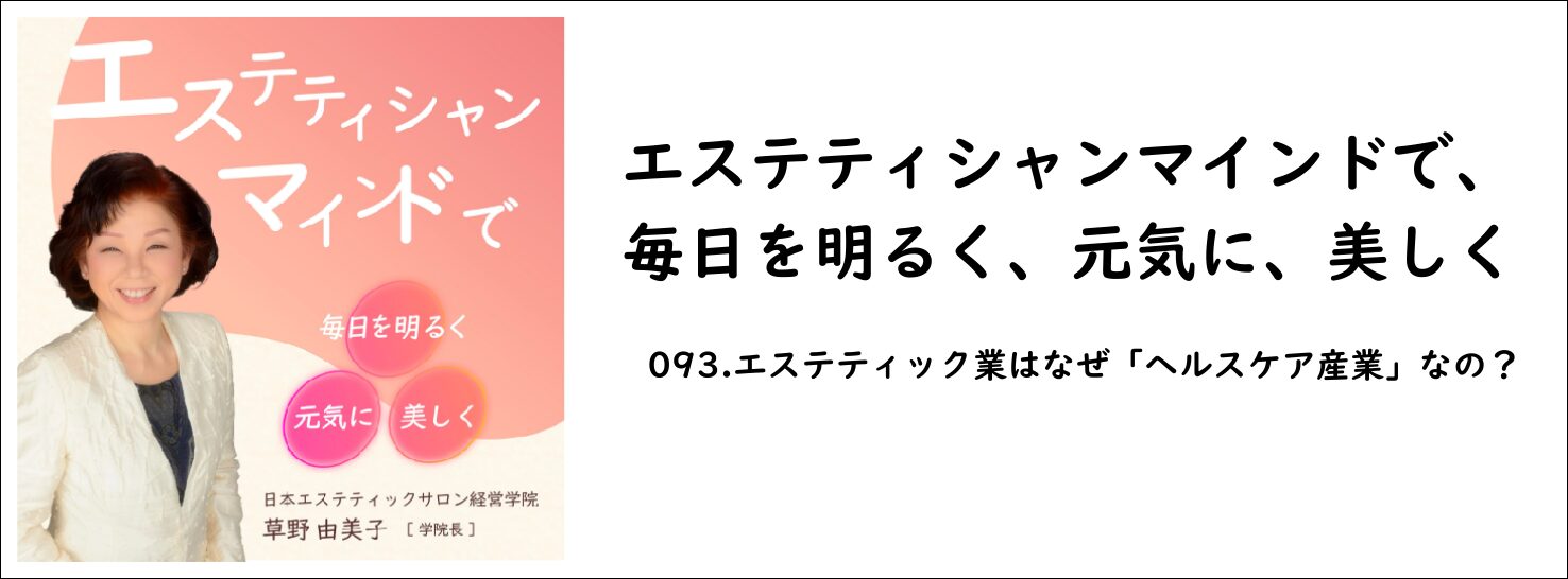 9f0a6c6ad5abcf777cc5094cebcf3f88 2025年12月8日 WRITER kanri@youplando この記事を書いている人 - WRITER - kanri@youplando この記事を書いている人 - WRITER - kanri@youplando 関連記事 - Related Posts - ポッドキャスト番組 093.エステティック業はなぜ「ヘルスケア産業」なの?が配信されました。 ポッドキャスト番組 033.エステティシャンとして勤務時代~赤の時代~Part2が配信されました。 ポッドキャスト番組 091.エステティシャンの本質とエステティシャンマインドが配信されました。 ポッドキャスト番組 031.誠実で信頼性の高い情報を提供することが配信されました。 最新記事 - New Posts - ポッドキャスト番組 098.安心こそ最強の集客力-「エステティックJIS」が証明する信頼の基準が配信されました。 ポッドキャスト番組 097.技術でも接客でもない——失客を招く「不明瞭な会計」という落とし穴が配信されました。 ポッドキャスト番組 096.不安を先回りして安心に変える——リピーターが増えるサロンの心遣いが配信されました。 ポッドキャスト番組 095.エステティシャンに必要な「指導」と「支援」を使い分ける応用力が配信されました。 - Comments - コメントをキャンセルメールアドレスが公開されることはありません。 ※ が付いている欄は必須項目ですコメント ※ 名前 ※ メール ※ サイト 次回のコメントで使用するためブラウザーに自分の名前、メールアドレス、サイトを保存する。 Δ