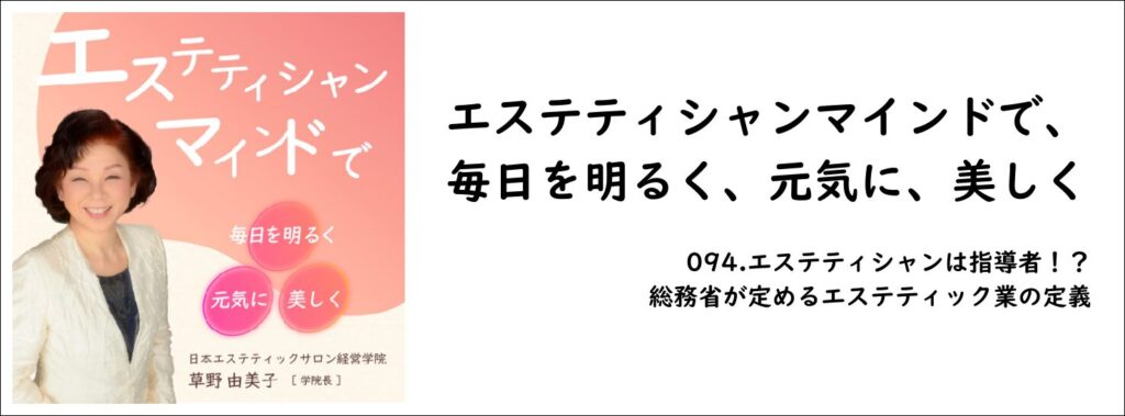 ポッドキャスト番組 094.エステティシャンは指導者!?総務省が定めるエステティック業の定義が配信されました。
